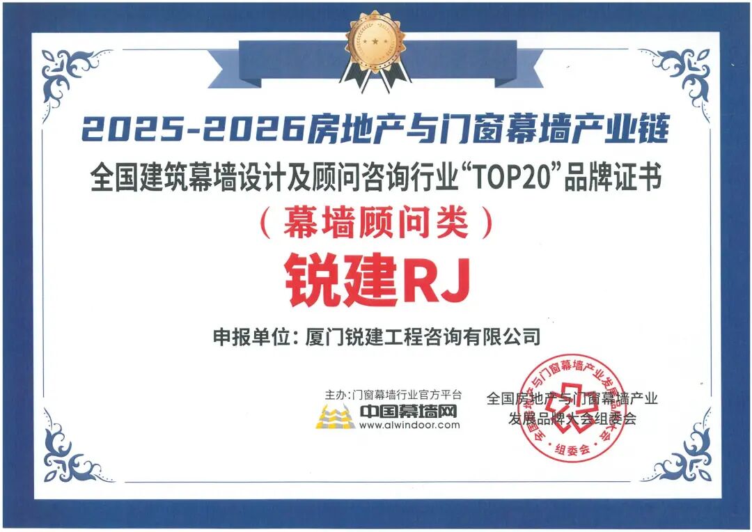 在本次博览会期间,锐建工程咨询凭借卓越的专业实力与良好的行业口碑,成功入选“全国幕墙顾问咨询20强”。这一荣誉不仅是对锐建多年来深耕技术、追求卓越的高度认可,更是厦门幕墙咨询行业高质量发展的生动缩影。锐建将继续肩负行业责任,以专业赋能品质,助力“好房子”建设与绿色低碳发展。